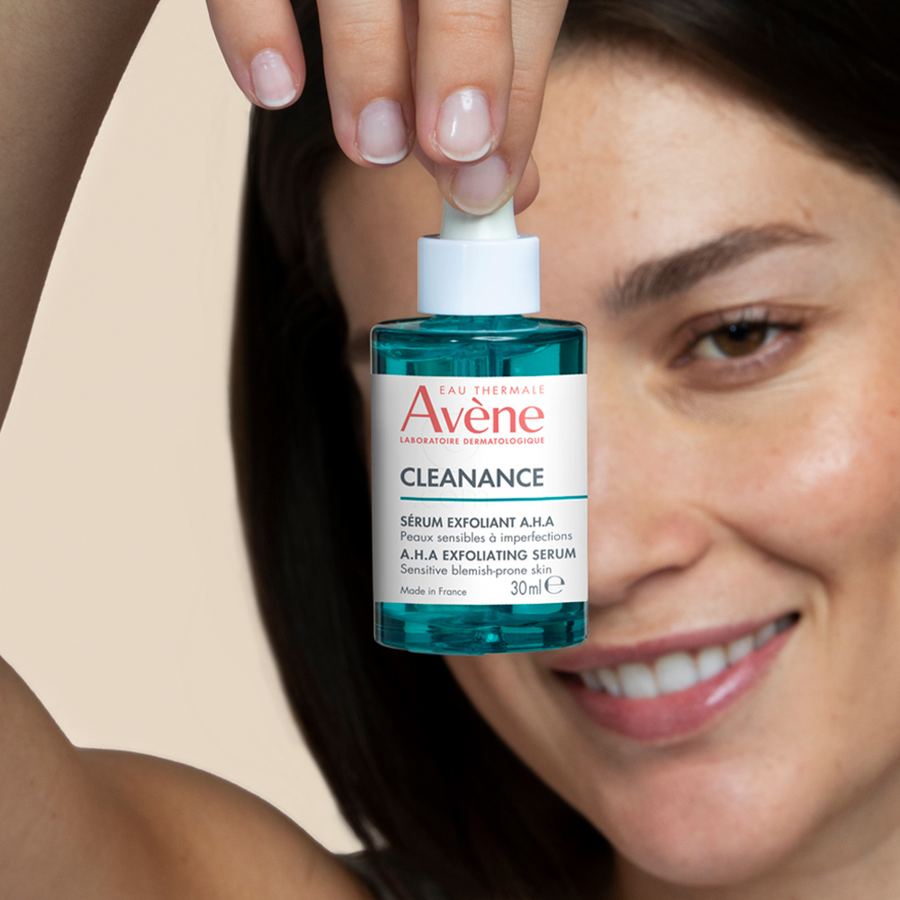 Avène Cleanance A.H.A. serum za eksfoliacijo je razvit posebej za mastno, občutljivo kožo, nagnjeno k aknam. Serum združuje ekskluzivni kislinski duo mlečne kisline (A.H.A) in jantarne kisline, ki nežno odstranjujeta odmrle kožne celice, zmanjšujeta nepravilnosti in zožujeta pore, hkrati pa izboljšujeta videz brazgotin po aknah.