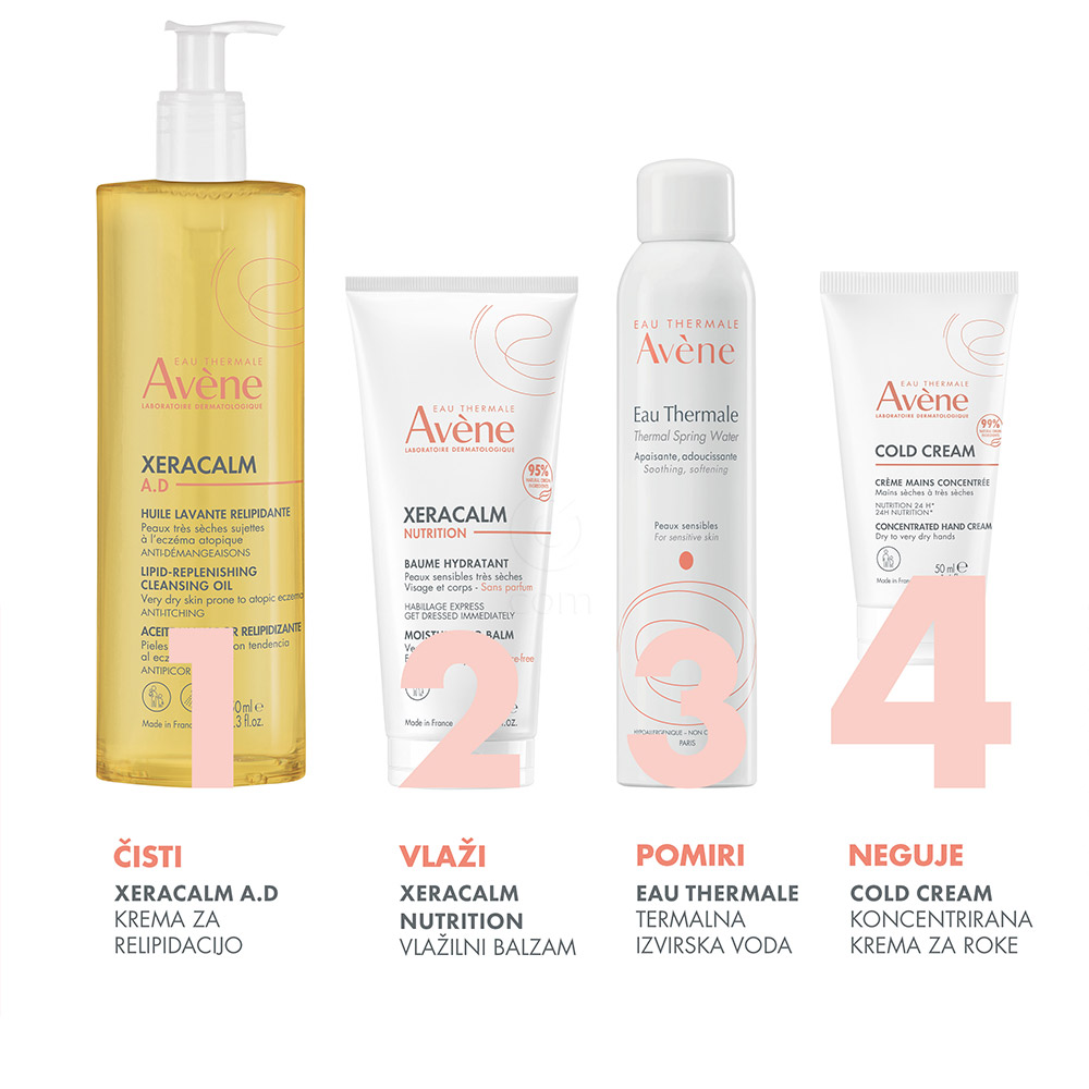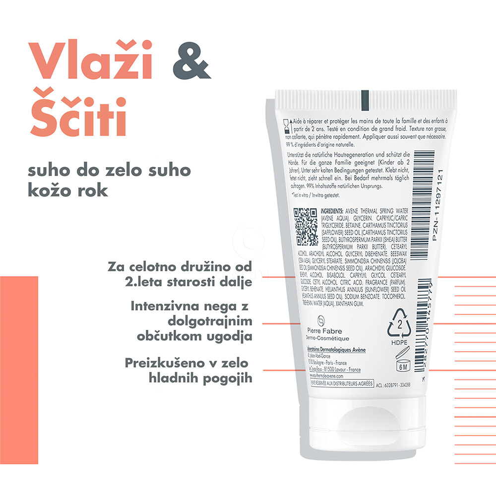 Avène Cold Cream koncentrirana krema za roke je bogata negovalna krema, posebej zasnovana za suho do zelo suho kožo. Preprečuje razpokanost, hrapavost in suhost kože, hkrati pa nudi dolgotrajno nego in zaščito. Primerna je za celotno družino, od 2. leta starosti dalje.