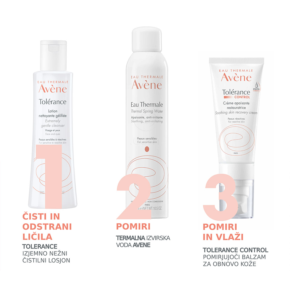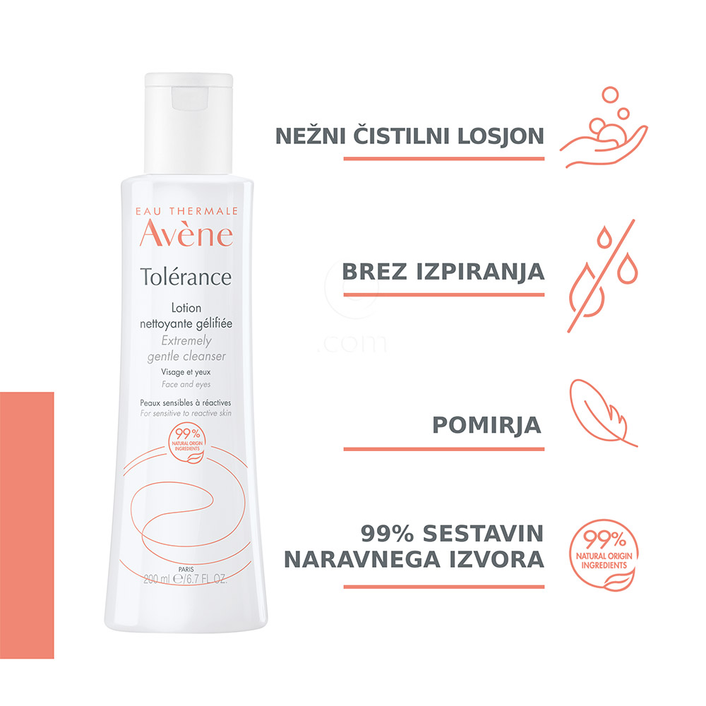 Avène Tolérance izjemno blagi losjon za čiščenje je posebej razvit za vse tipe občutljive in reaktivne kože. Z izjemno nežno formulo učinkovito odstranjuje nečistoče in ličila, ne da bi pri tem dražil ali izsušil kožo. Primeren je za čiščenje obraza, občutljivega področja okoli oči in ustnic. Vsebuje 99 % sestavin naravnega izvora ter je popolnoma brez dišav, kar zmanjšuje tveganje za alergijske reakcije in draženje.
