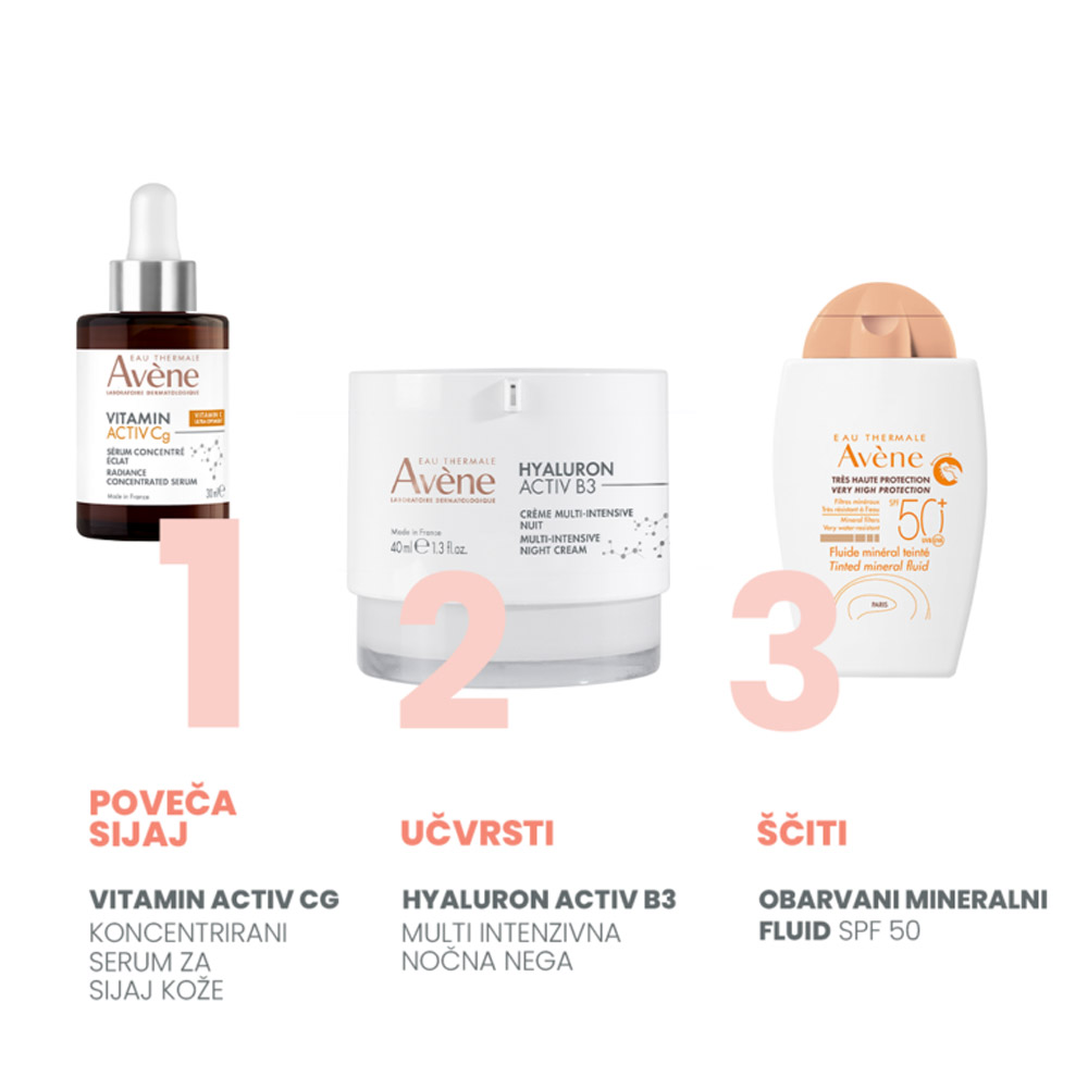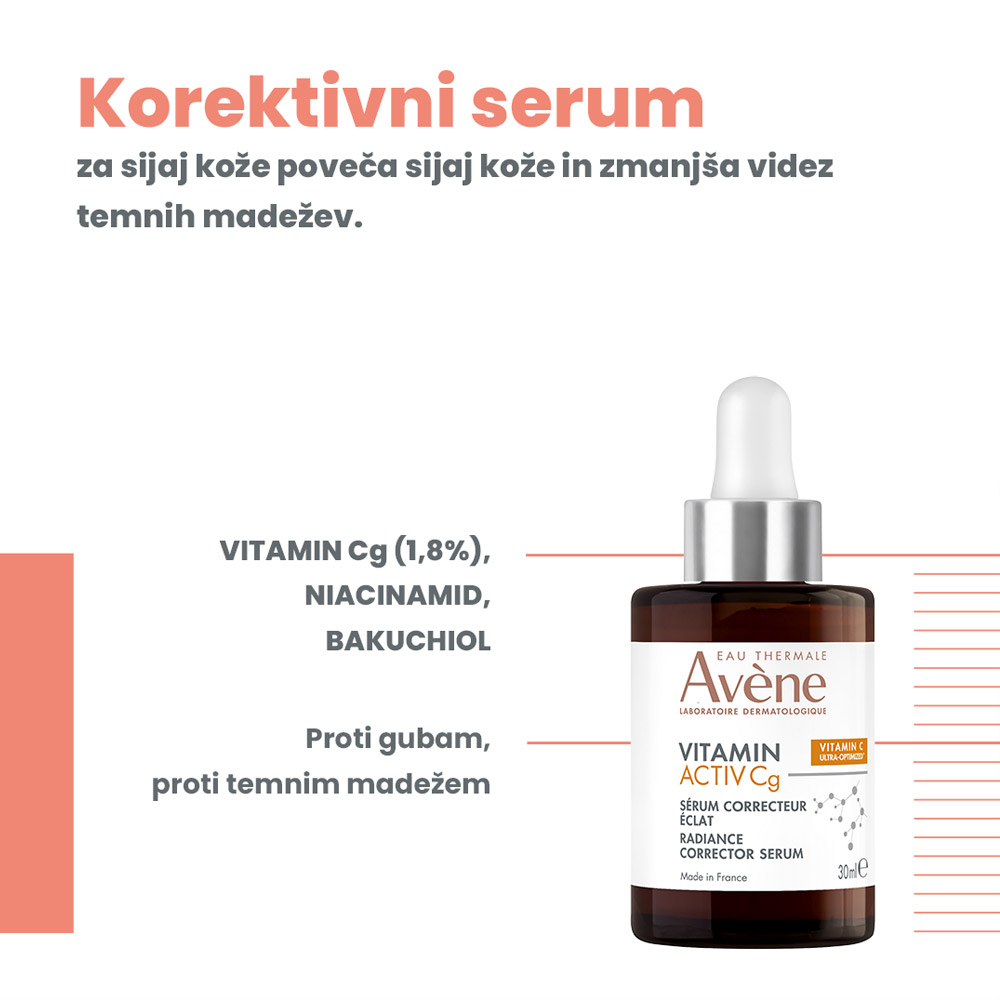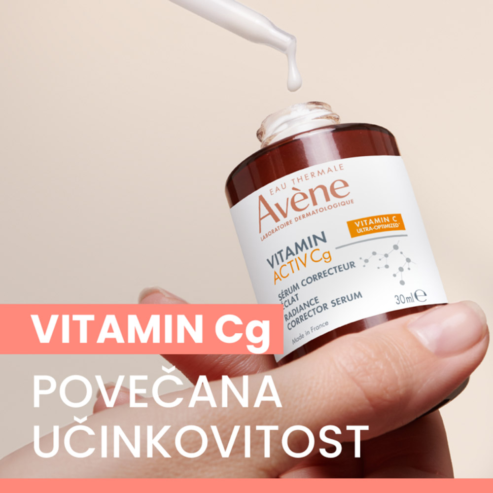 Avene Vitamin Activ Cg korektivni serum je visoko učinkovit serum s trojnim delovanjem, zasnovan za izboljšanje videza kože in njeno zaščito pred prezgodnjim staranjem. Vsebuje stabiliziran vitamin C (Vitamin CG), ki deluje kot močan antioksidant, posvetljuje temne madeže ter spodbuja nastajanje kolagena za čvrstejšo, bolj gladko kožo.