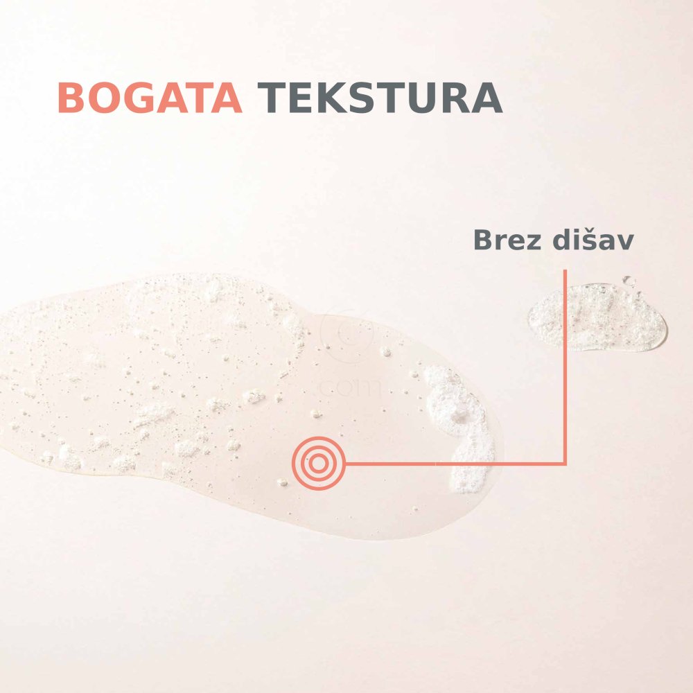 Olje je obogateno z Avène termalno vodo, ki je znana po svojem pomirjujočem in protivnetnem delovanju. Njegova tekstura je prijetna, nežna in se ob stiku z vodo spremeni v rahlo mlečno emulzijo, ki nežno očisti kožo, ne da bi pustila mastnega filma.
