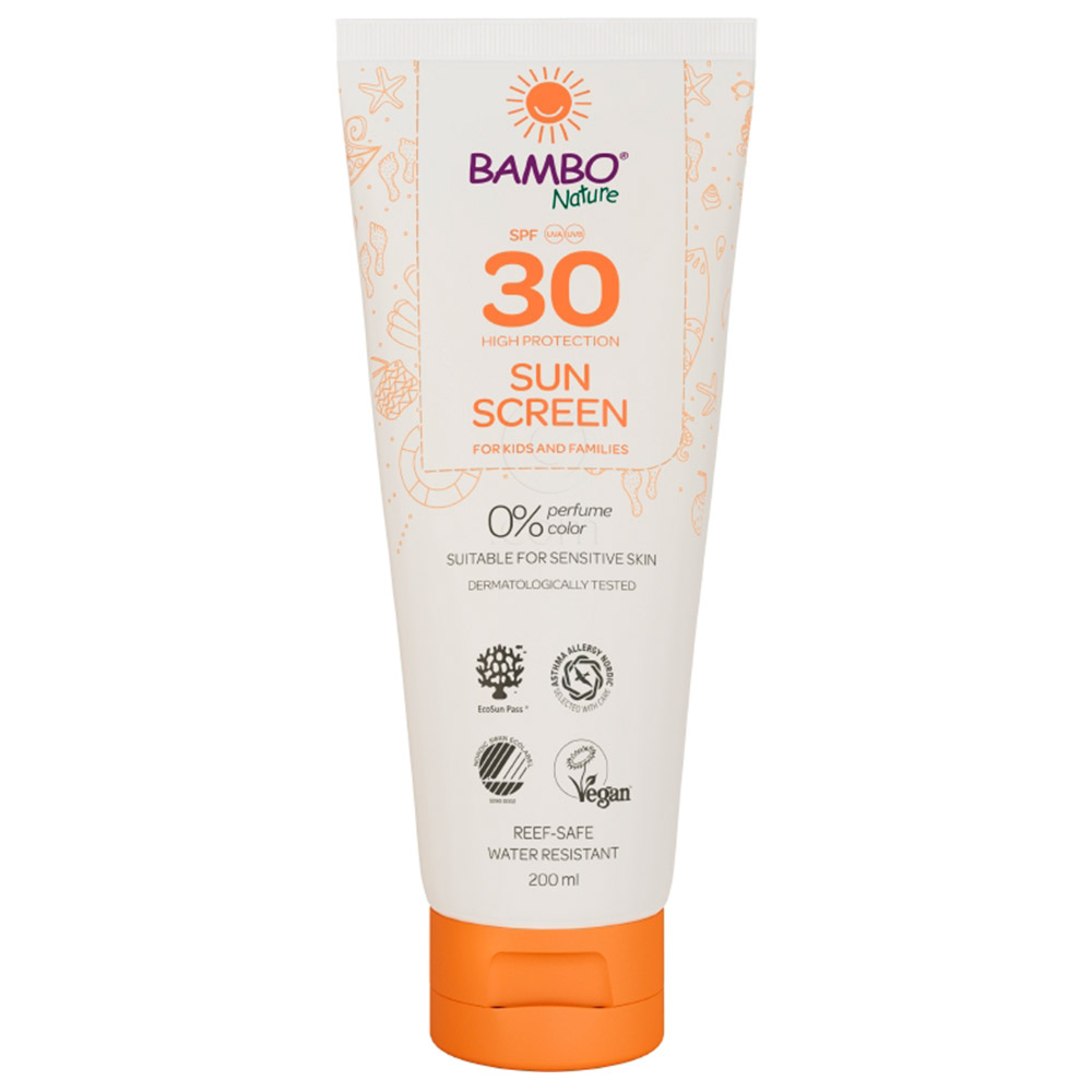 Bambo Nature Sunscreen SPF 30 je naraven, certificiran in veganski losjon za zaščito kože pred soncem, zasnovan za potrebe celotne družine, vključno z dojenčki in otroki. Z visokim zaščitnim faktorjem (SPF 30) učinkovito ščiti pred škodljivimi UVA in UVB žarki, saj absorbira do 96 % UV sevanja. Formula je fotostabilna, kar pomeni, da ohranja zaščitne lastnosti tudi ob dolgotrajni izpostavljenosti soncu.