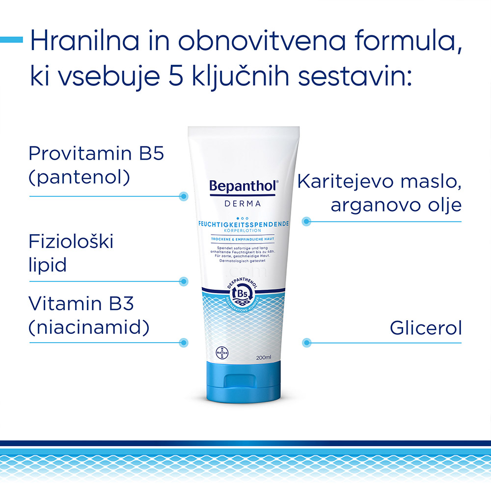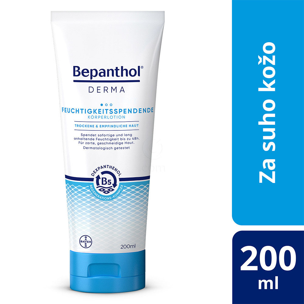 Bepanthol Derma vlažilni losjon za telo je zasnovan za vsakodnevno nego suhe in občutljive kože. Njegova lahka, nelepljiva tekstura se hitro vpije, kar zagotavlja takojšnjo hidratacijo in olajšanje občutka suhosti.