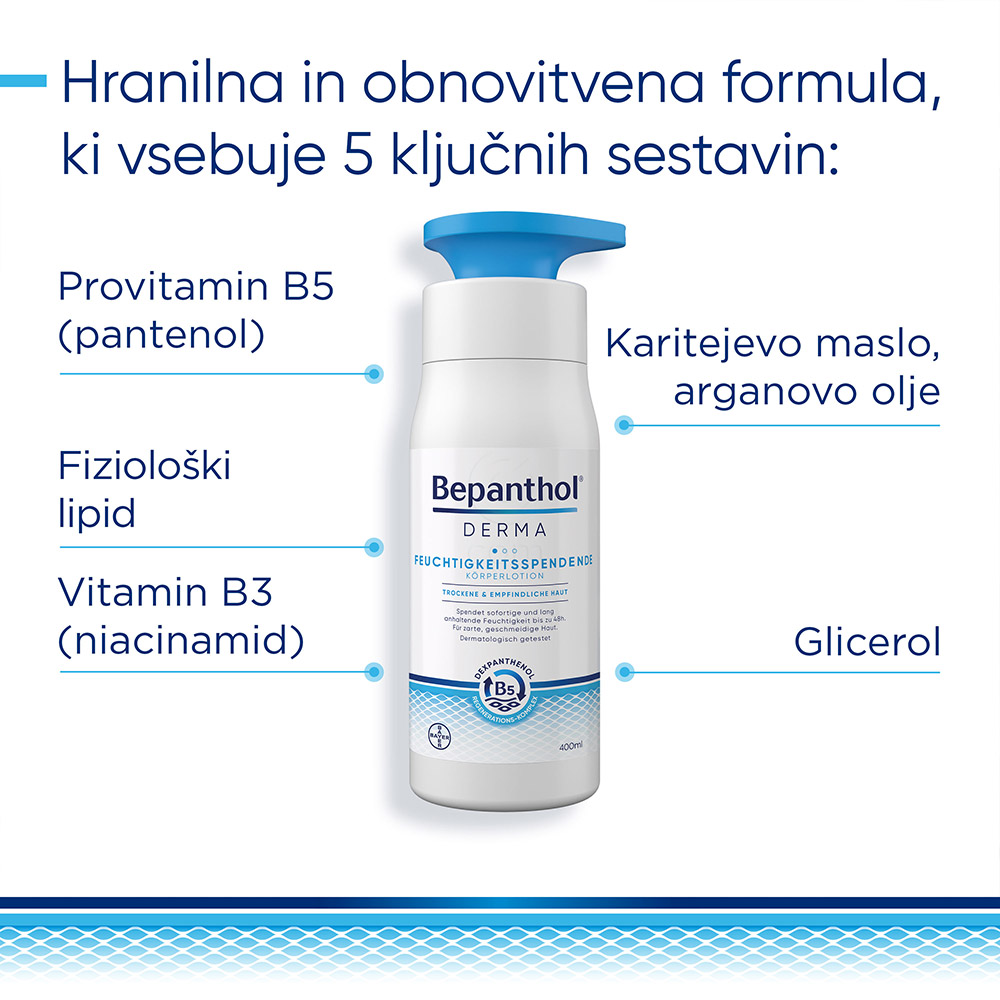 Bepanthol Derma vlažilni losjon za telo je idealna rešitev za vsakodnevno nego suhe in občutljive kože. Njegova lahka, nelepljiva tekstura omogoča hitro vpijanje in zagotavlja takojšnje ter dolgotrajno vlaženje, ki traja do 48 ur. Ob redni uporabi kožo naredi mehko, gladko in bolj odporna proti zunanjim vplivom.