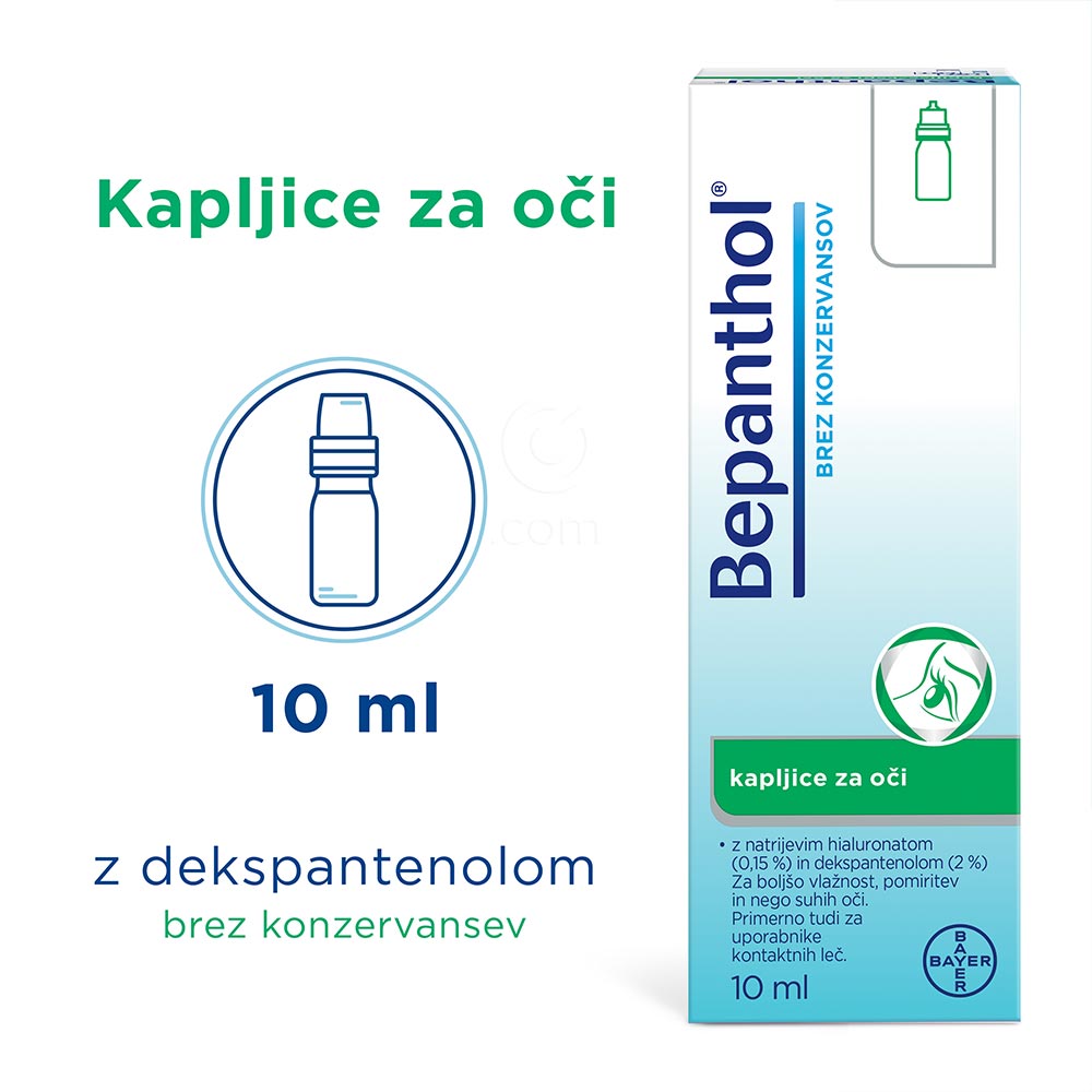 Bepanthol kapljice za oči so medicinski pripomoček, zasnovan za dolgotrajno olajšanje težav, kot so rdeče, suhe ali razdražene oči zaradi mehanskih obremenitev (npr. kontaktne leče), okoljskega stresa (klimatske naprave, veter, suh zrak) ali preobremenjenosti zaradi intenzivnega gledanja v zaslone.