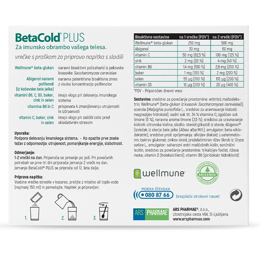 BetaCold PLUS je učinkovito prehransko dopolnilo v obliki praška za pripravo okusnega napitka, ki vsebuje klinično preizkušen bioaktivni Wellmune beta-glukan in naravni izvleček Abigenol iz kočevske bele jelke, bogat z bioaktivnimi polifenoli. Izdelek vključuje vitamine C, D3 in B6 ter minerale cink, selen in baker, ki skupaj podpirajo delovanje imunskega sistema, zmanjšujejo utrujenost ter ščitijo celice pred oksidativnim stresom. Naravni izvleček limon dodaja prijeten okus in zagotavlja dnevni vnos vitamina C iz limoninega soka.