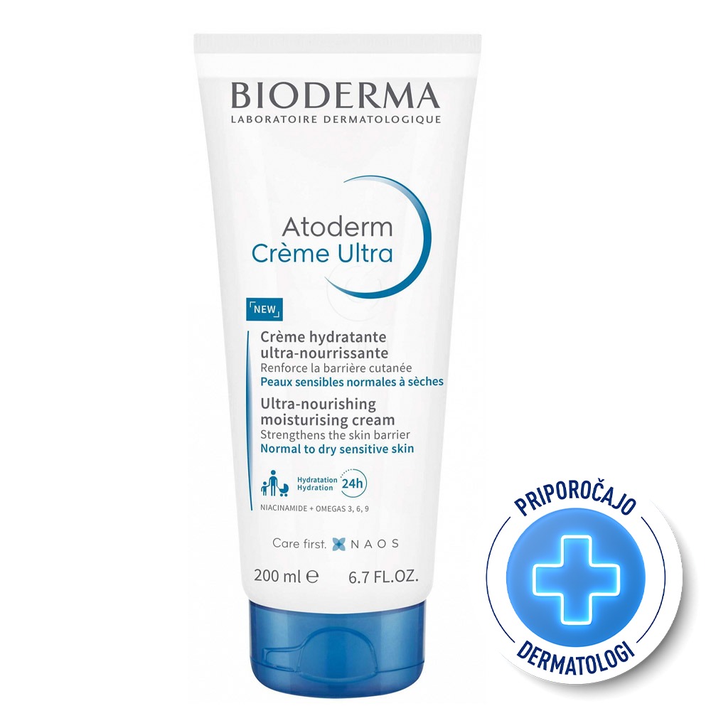 Bioderma Atoderm Ultra je izjemno hranljiva vlažilna krema, namenjena vsakodnevni negi normalne do suhe občutljive kože obraza in telesa. Krema deluje na dveh ravneh: intenzivno vlaži do 24 ur in krepi kožno bariero za dolgotrajno zaščito pred izgubo vlage. Vsebuje niacinamid in esencialne maščobne kisline (omega 3, 6, 9), ki pomagajo obnoviti lipidni sloj kože in pomiriti občutljivo kožo. Primerna je za dojenčke, otroke in odrasle ter zagotavlja strokovno nego, ki ohranja kožo mehko, gladko in zaščiteno.