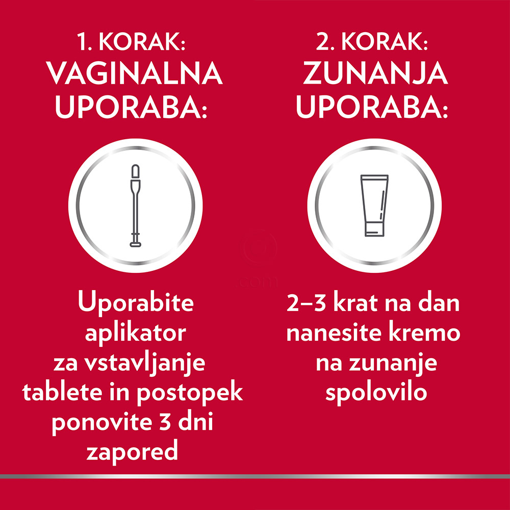 Zdravilo se uporablja pri ženskah za zdravljenje kandidnega vaginitisa in kandidnega vulvitisa, ter pri moških za zdravljenje kandidnega balanitisa. Simptomi lahko vključujejo bel sirast izcedek, srbenje, pordelost, oteklino, pekoče razjede ter bolečino pri uriniranju. Če so sočasno prizadeti notranji in zunanji predeli spolovil, je priporočeno kombinirano zdravljenje z vaginalnimi tabletami in kremo.