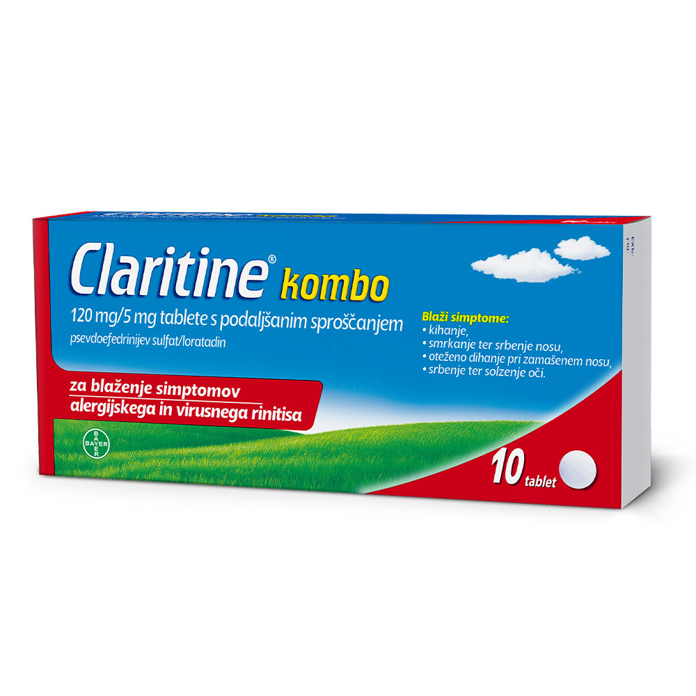 Claritine kombo je zdravilo, ki združuje antihistaminski in dekongestivni učinek za hitro in učinkovito lajšanje simptomov alergijskega rinitisa (senenega nahoda) in virusnega rinitisa (prehlada). Vsebuje kombinacijo dveh učinkovin – psevdoefedrinijevega sulfata, ki zmanjšuje oteklino nosne sluznice in omogoča lažje dihanje, ter loratadina, ki zmanjšuje alergijske simptome, kot so kihanje, smrkanje, srbenje nosu, solzenje in pordelost oči. Tablete s podaljšanim sproščanjem zagotavljajo dolgotrajen učinek in se jemljejo dvakrat na dan, kar prinaša olajšanje skozi ves dan. Primerno za odrasle in mladostnike, starejše od 12 let, ki potrebujejo hitro in celostno olajšanje alergijskih in prehladnih simptomov.