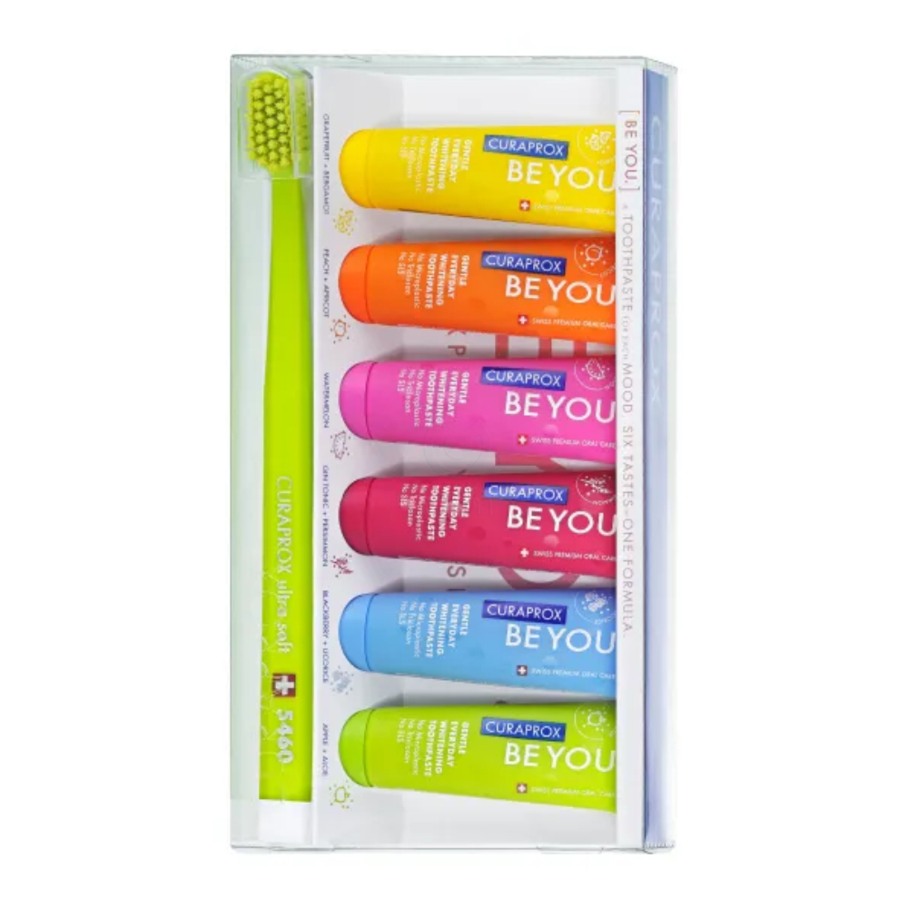 Začetno pakiranje CURAPROX [BE YOU.] vključuje šest različnih sadnih okusov zobnih past, ki omogočajo, da preizkusite in izberete svoj najljubši okus. Vsaka pasta vsebuje naravne sestavine in zelišča, ki podpirajo naravno zaščito zob in dlesni ter prispevajo k boljši ustni higieni. Formule zagotavljajo zaščito pred zobno gnilobo, trajno svež dah, zmanjšujejo občutljivost zob, preprečujejo nastanek aft, spodbujajo naravno delovanje sline, zavirajo nastajanje plaka in skrbijo za zdrave dlesni. Paket je idealen za vsakodnevno nego, hkrati pa ponuja zabavno in okusno izkušnjo čiščenja zob za vsak dan in vsako razpoloženje.