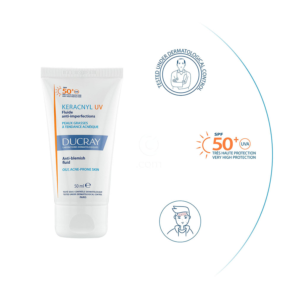 Ducray Keracnyl UV fluid za obraz ZF 50+ je posebej zasnovan za mastno kožo, nagnjeno k aknam, in zagotavlja zelo visoko zaščito pred UV-žarki. Njegova inovativna „Dry Touch“ tekstura matira kožo in zagotavlja dolgotrajen učinek proti sijaju, ne da bi pustila masten občutek.