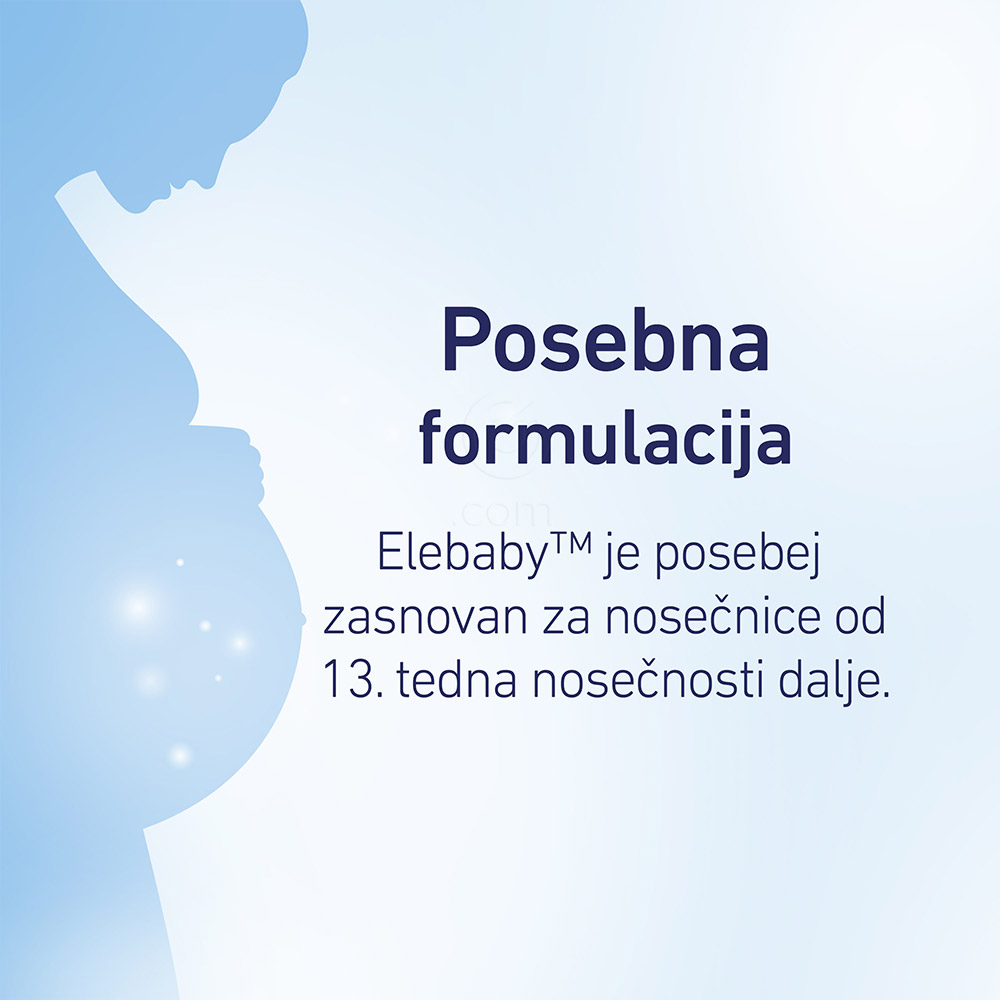EleBaby kapsule so skrbno oblikovano prehransko dopolnilo za nosečnice v drugem in tretjem tromesečju, ki vsebuje 18 vitaminov in mineralov ter 200 mg omega-3 maščobne kisline DHA iz visoko kakovostnega ribjega olja MEG-3. Poleg tega vsebuje posebno obliko folne kisline Metafolin z izboljšano biorazpoložljivostjo. DHA prispeva k normalnemu razvoju možganov in vida pri plodu in dojenčku, folna kislina pa k razvoju materinega tkiva med nosečnostjo in delovanju imunskega sistema. Dodani so tudi vitamini in minerali, ki podpirajo nastajanje rdečih krvničk, zdravje kosti in optimalno delovanje imunskega sistema.