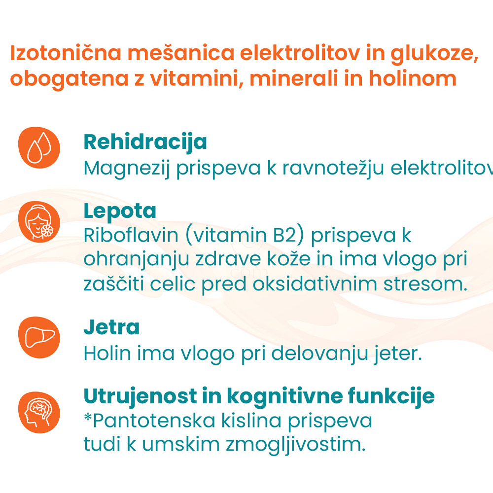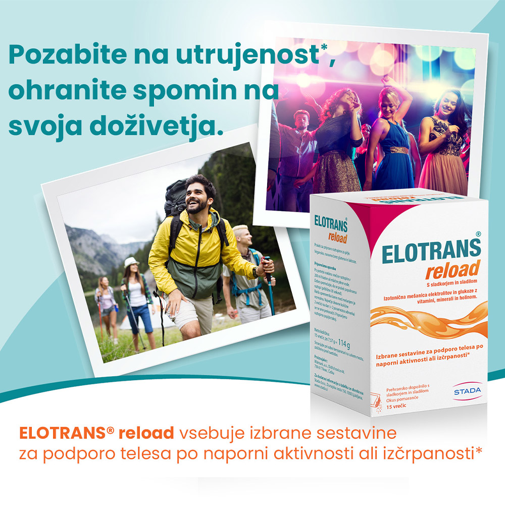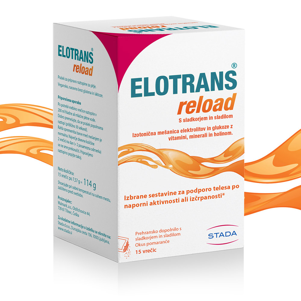 Elotrans Reload je prehransko dopolnilo, namenjeno podpori telesu po naporni aktivnosti ali ob občutku izčrpanosti. Gre za izotonično mešanico elektrolitov in glukoze, ki zagotavlja hitro hidracijo in ravnotežje elektrolitov. Magnezij prispeva k ohranjanju ravnovesja elektrolitov, pantotenska kislina (vitamin B5) in riboflavin (vitamin B2) pa pomagata zmanjševati utrujenost in izčrpanost ter podpirata sproščanje energije pri presnovi. Riboflavin dodatno prispeva k ohranjanju zdrave kože in zaščiti celic pred oksidativnim stresom, medtem ko holin podpira delovanje jeter. Izdelek je veganski, brez glutena in laktoze ter ima prijeten okus pomaranče, kar omogoča prijetno in učinkovito nadomestitev tekočin ter pomembnih hranil po telesni aktivnosti.