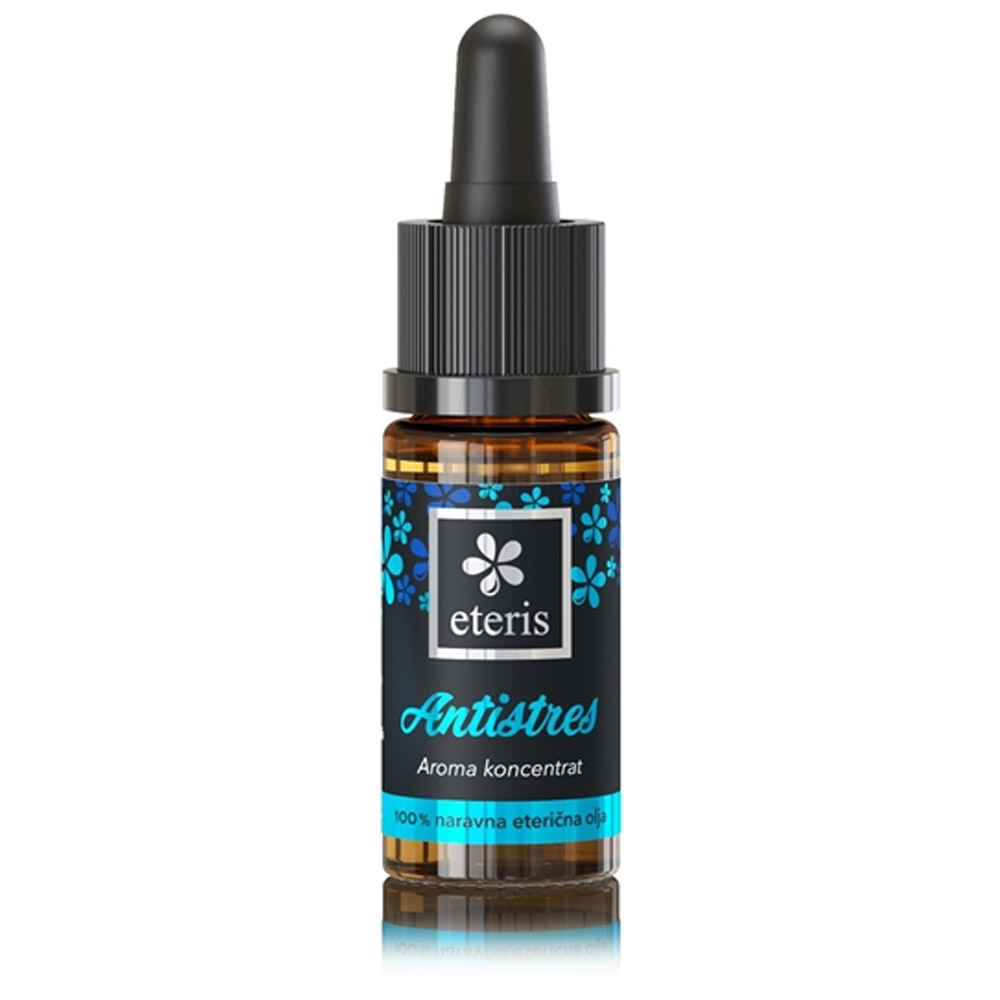 Eteris Aroma koncentrat Antistres je naravni kozmetični izdelek, namenjen ustvarjanju sproščujoče in pomirjujoče atmosfere. Vsebuje čista in naravna eterična olja bergamotke, bosvelije, bio ilang-ilanga, sivke in baldrijana, ki skupaj ustvarjajo edinstveno aromaterapevtsko mešanico.