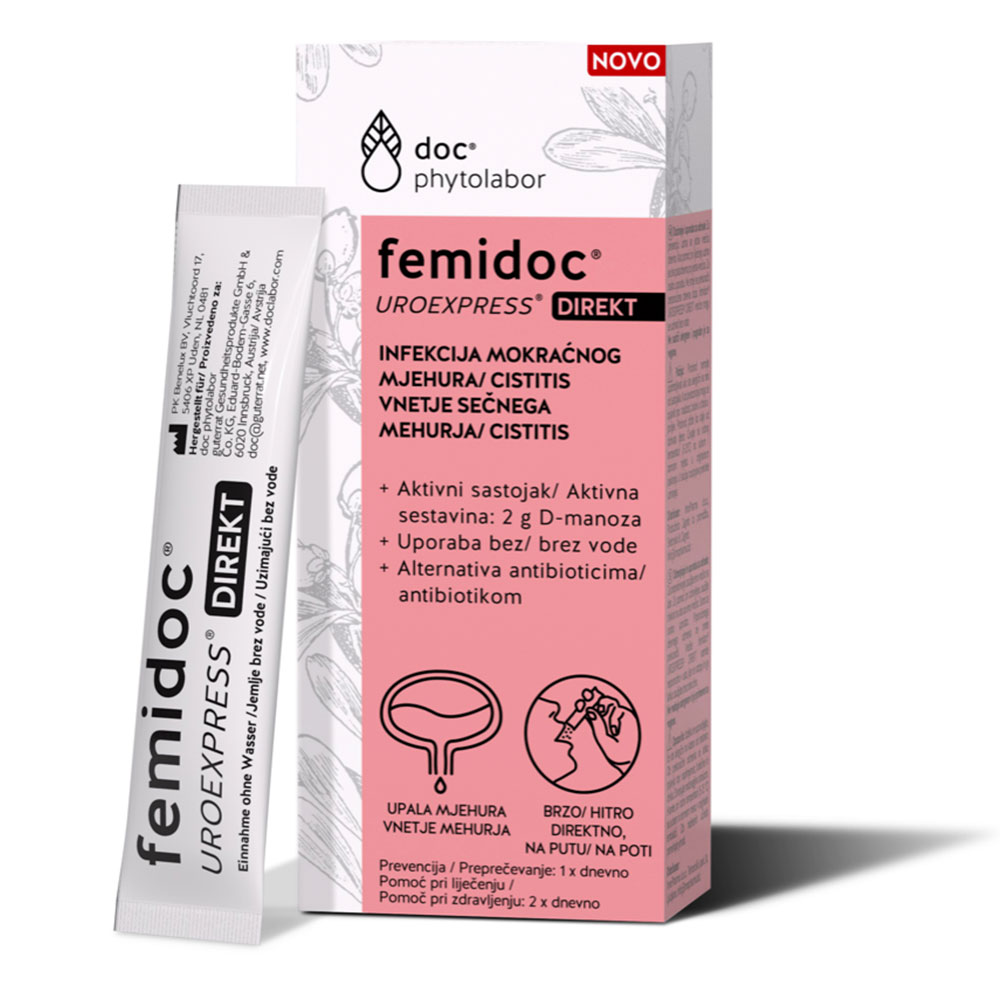 Femidoc Uro Express Direkt je medicinski pripomoček, ki pomaga preprečevati ponavljajoče se okužbe sečil in mehurja, ki jih povzroča bakterija E. coli. Aktivna sestavina D-manoza se veže na bakterije in preprečuje njihovo pritrditev na stene urinarnega trakta, kar omogoča izpiranje bakterij z uriniranjem. Izdelek je namenjen tako preventivi kot podpori zdravljenja okužb sečil. Vrečke lahko zaužijete brez vode, primerni pa so za vegetarijance in vegane. Femidoc Uro Express Direkt ne vsebuje alergenov in je enostaven za uporabo.