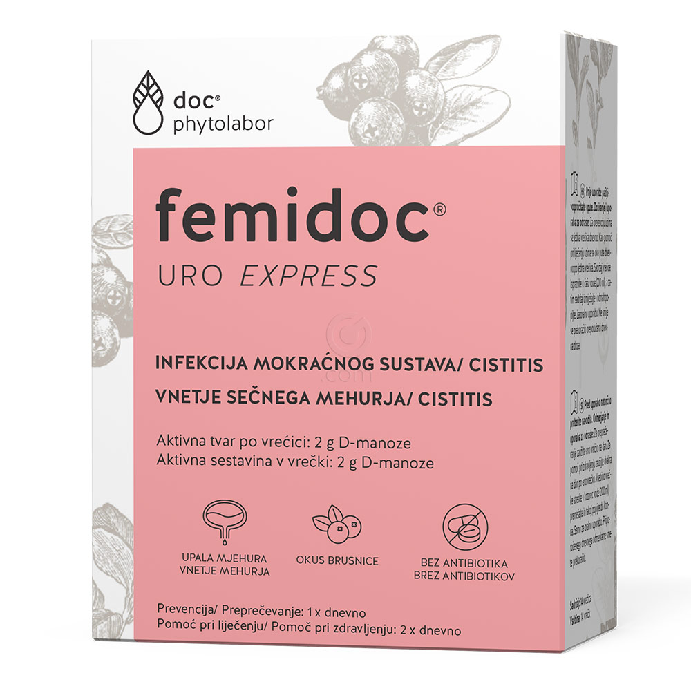 Femidoc Uro Express je medicinski pripomoček, namenjen učinkoviti pomoči pri zdravljenju okužb sečil in mehurja, ki jih povzroča bakterija Escherichia coli (E. coli). Izdelek vsebuje naravno prisotno D-manozo, ki deluje tako, da se veže na bakterije in preprečuje njihovo pritrditev na stene urinarnega trakta. Tako se bakterije lažje izperejo z urinom, kar pomaga hitreje odpraviti neprijetne simptome okužb, kot so pekoč občutek med uriniranjem, pogost pritisk na uriniranje, bolečine v trebuhu in pogosto uriniranje. Femidoc Uro Express je primeren tako za zdravljenje kot za preprečevanje ponovnih vnetij mehurja, zato predstavlja varno in naravno rešitev za ohranjanje zdravja sečil.