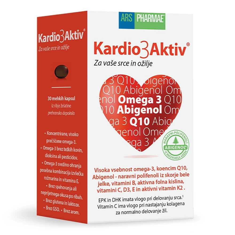 Kardio3Aktiv je edinstvena kombinacija naravnih hranil v eni kapsuli, namenjena podpori delovanja srca, ožilja in splošnega počutja. Vsebuje visoko koncentracijo omega-3 maščobnih kislin optimalnega razmerja EPK/DHK, polifenole iz kočevske jelke (Abigenol), koencim Q10, vitamine B1, B6, B12, aktivno folno kislino Quatrefolic, vitamin E, vitamin D3 in aktivni vitamin K2. EPK in DHK imata pomembno vlogo pri delovanju srca, vitamin B1 dodatno podpira srčno funkcijo, vitamini B6, B12 in folna kislina prispevajo k presnovi homocisteina ter zmanjšanju utrujenosti in izčrpanosti, vitamin K2 prispeva k normalnemu strjevanju krvi, vitamin E pa pomaga zaščititi celice pred oksidativnim stresom.