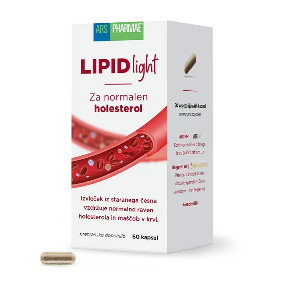 LIPIDlight Ars Pharmae je inovativno prehransko dopolnilo, ki združuje moč naravnih izvlečkov ABG10+ (staran črni česen), Bergavit 40 (citrus bergamotka) in koencima Q10. Njegova edinstvena formula podpira vzdrževanje normalne ravni holesterola in maščob v krvi ter spodbuja energijski metabolizem celic, zlasti srčnih. Izdelek je primeren za odrasle od 18. leta dalje, ne vsebuje vonja ali okusa po česnu in je enostaven za uporabo – le dve kapsuli na dan. LIPIDlighttemelji na premium kakovosti in kontroliranem poreklu sestavin, kar zagotavlja varnost in učinkovitost.
