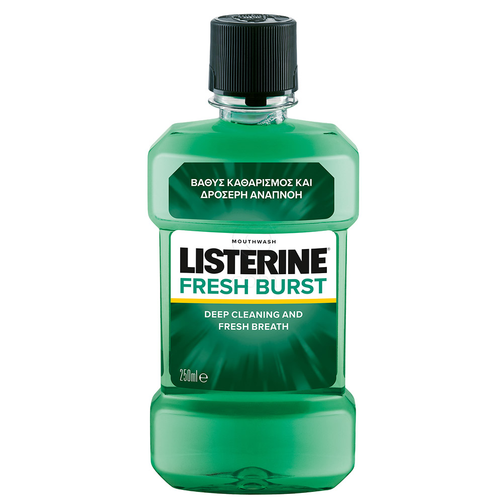 Listerine FreshBurst ustna voda je učinkovita rešitev za vsakodnevno nego ustne votline, ki združuje zaščito pred zobnimi oblogami in osvežitev daha. Ob uporabi dvakrat dnevno zagotavlja 24-urno zaščito pred nastajanjem zobnih oblog, hkrati pa pomaga preprečevati gingivitis.