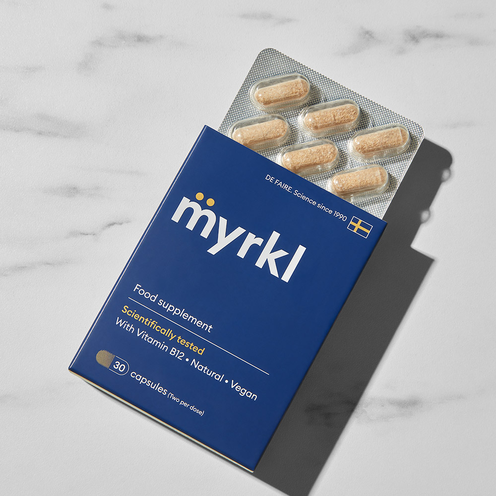 MYRKL je prehransko dopolnilo v kapsulah, ki vsebuje skrbno izbrane mikroorganizme, fermentirane riževe otrobe, vitamin B12 in L-cistein. Mikroorganizmi, kot sta Bacillus Subtilis in Bacillus Coagulans, podpirajo zdravo črevesno mikrofloro, medtem ko vitamin B12 prispeva k delovanju imunskega sistema, delovanju živčnega sistema, sproščanju energije pri presnovi ter normalnemu psihološkemu delovanju. MYRKL kapsule so primerne za vegane in vegetarijance ter proizvedene na Švedskem, kar zagotavlja visoko kakovost izdelka. Dnevni vnos dveh kapsul zjutraj ali zvečer je preprost način za podporo telesu pri vsakodnevnem delovanju.