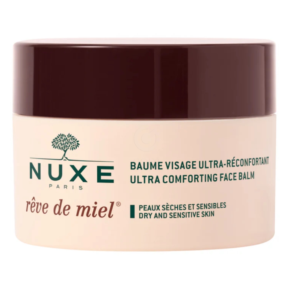 Nuxe Rêve de Miel Pomirjujoči balzam za obraz je bogata nega, namenjena suhi in občutljivi koži, ki potrebuje intenzivno hranjenje, pomiritev in obnovo. Njegova izjemno bogata tekstura se ob stiku s kožo nežno stopi, jo ovije v občutek udobja in zapolni s subtilnim vonjem medu, mimoze in akacije.