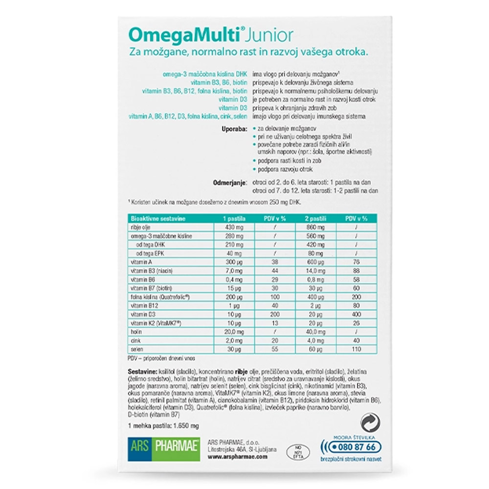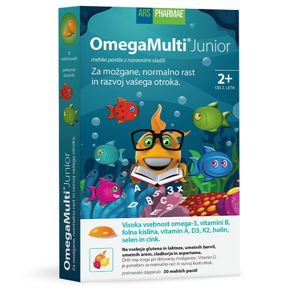 OmegaMulti Junior so okusne mehke pastile za otroke, namenjene podpori normalnega razvoja in delovanja možganov, rasti ter splošnemu dobremu počutju. Formulacija vsebuje visoko vsebnost omega-3 maščobnih kislin v optimalnem razmerju DHK/EPK, ki so ključne za razvoj možganov in vida.