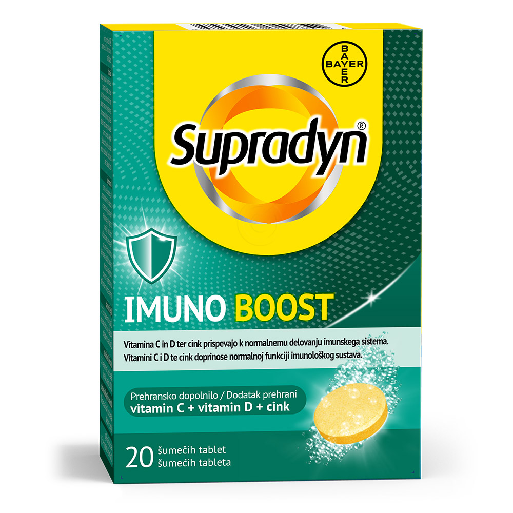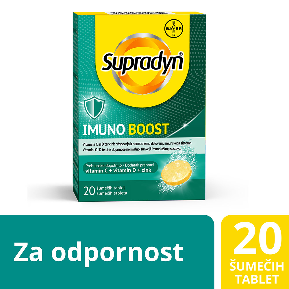 Supradyn IMUNO BOOST je prehransko dopolnilo v obliki šumečih tablet, zasnovano za podporo normalnemu delovanju imunskega sistema. Vsebuje vitamina C in D ter cink, ki skupaj prispevajo k ohranjanju odpornosti, še posebej v obdobjih povečanih potreb, kot so hladnejši meseci, stres ali utrujenost.