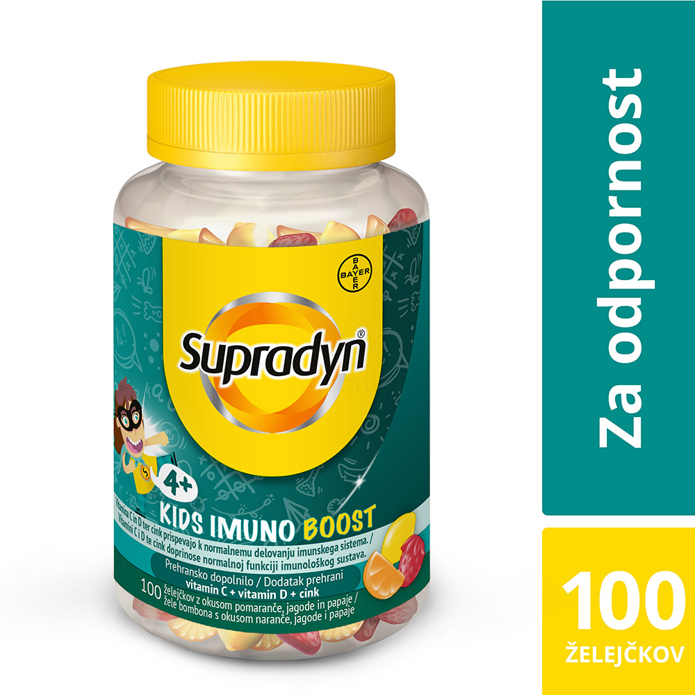 Supradyn Kids IMUNO BOOST so okusni želejčki za otroke, ki vsebujejo vitamina C in D ter cink, pomembne za normalno delovanje imunskega sistema. Primerni so za otroke, ki potrebujejo dodatno podporo odpornosti, zlasti v hladnejših mesecih, ob večjih telesnih in duševnih obremenitvah ali v času okrevanja.