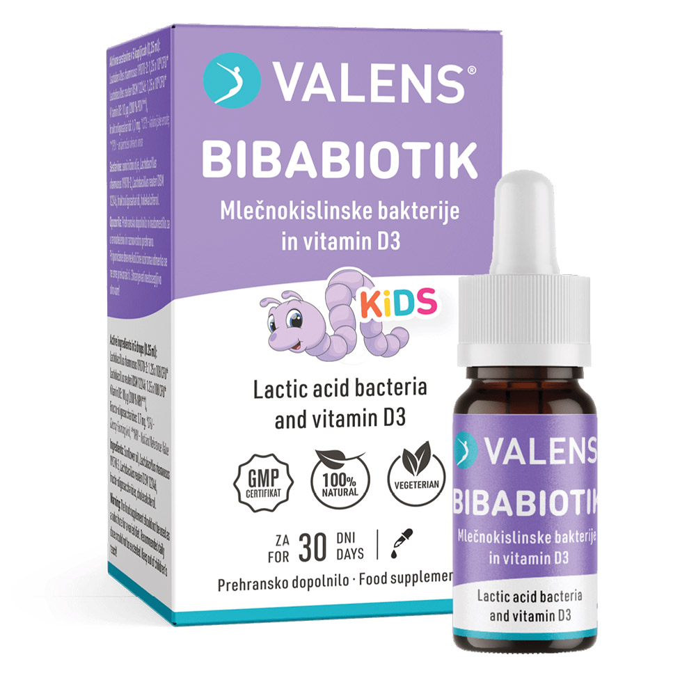 Valens BibaBiotik kapljice so skrbno zasnovano prehransko dopolnilo, namenjeno novorojenčkom od 2. tedna starosti, dojenčkom in otrokom. Izdelek vsebuje dva znanstveno raziskana seva mlečnokislinskih bakterij – Lactobacillus rhamnosus in Lactobacillus reuteri, ki se naravno pojavljata v človeškem prebavnem traktu. Ta koristna mikrobiološka seva podpirata uravnoteženo črevesno mikrobioto ter s tem splošno zdravje in dobro počutje otroka.