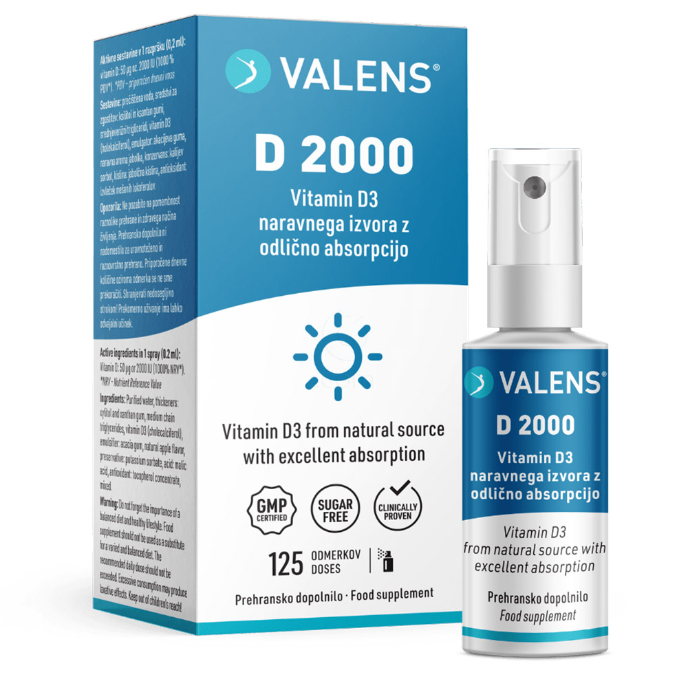 Valens D 2000 je kakovostno prehransko dopolnilo v obliki ustnega pršila, ki vsebuje vitamin D3 naravnega izvora in ima prijeten okus jabolka. Vitamin D je ključen za številne procese v telesu in je posebej pomemben v zimskih mesecih, ko je izpostavljenost sončni svetlobi manjša.