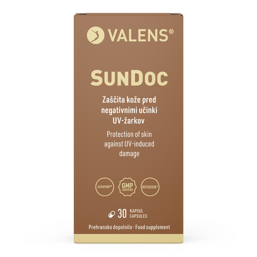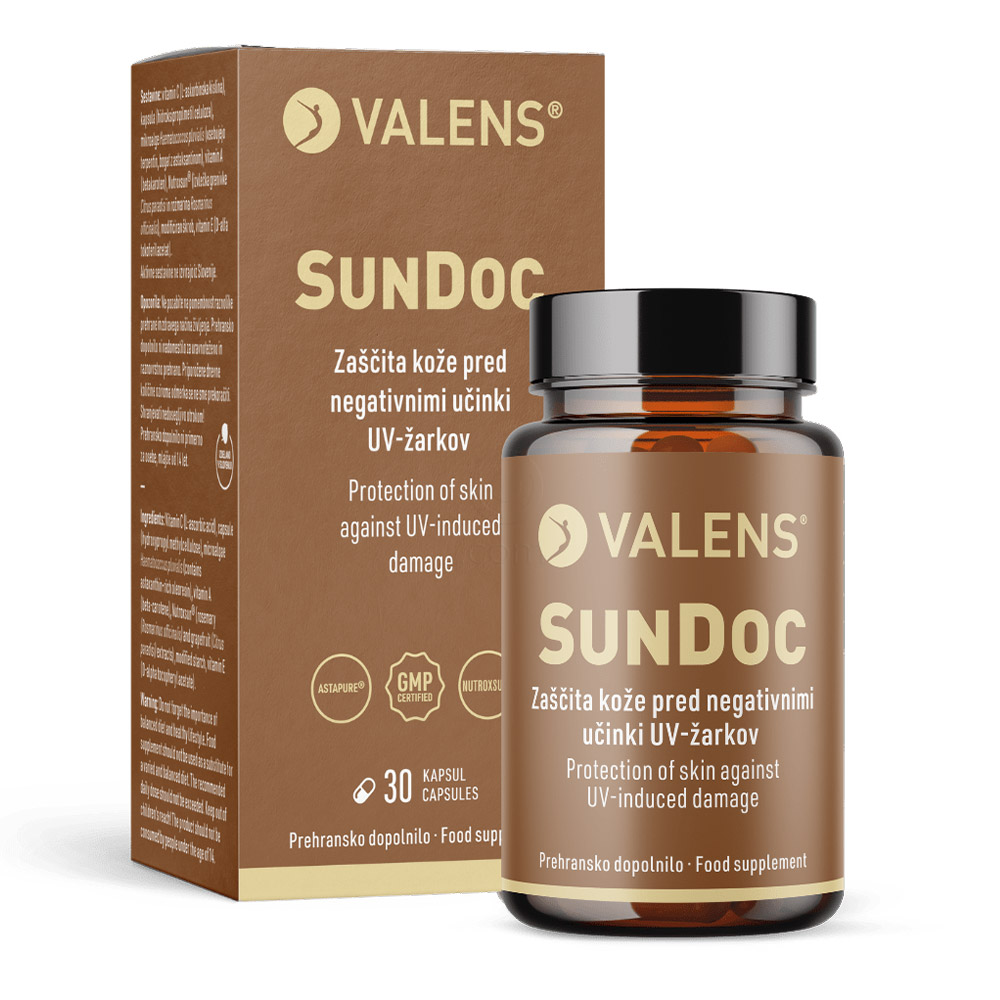 Valens SunDoc kapsule so napredno prehransko dopolnilo, zasnovano za zaščito kože od znotraj. Vsebujejo edinstveno kombinacijo močnih antioksidantov in naravnih izvlečkov, ki pomagajo ščititi kožo pred oksidativnim stresom in prezgodnjim staranjem, ki ga povzročajo UV žarki ter drugi škodljivi dejavniki iz okolja.